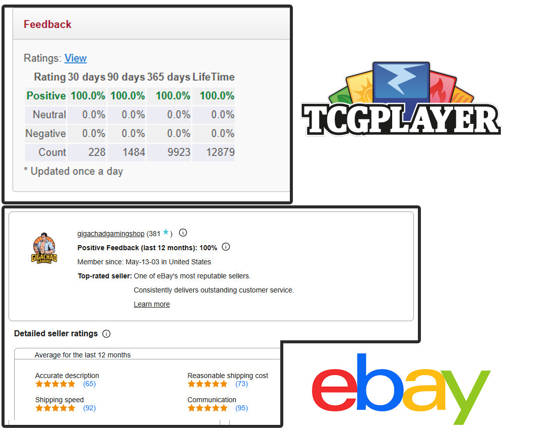 We pride ourselves in having impeccable feedback across multiple platforms. You will find us on TCGPlayer, Ebay, TikTokShop, ManaPool and Walmart.